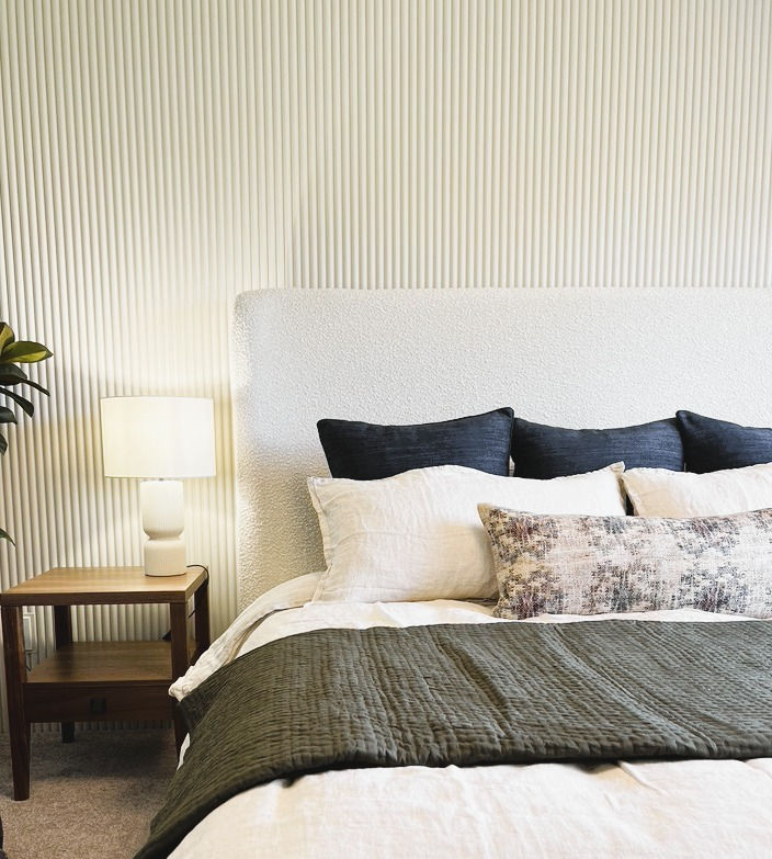 This serene primary bedroom was reimagined into a luxurious, hotel-inspired retreat. From the custom fluted accent wall and full drapery to the addition of an electric fireplace and layered bedding, every element was designed for comfort and calm. The result is a space that feels both tailored and tranquil—a quiet sanctuary made for rest and reset.