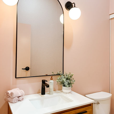 This commercial renovation took a dark, outdated accountant’s office and completely reimagined it as a bright, airy suite rental space. We opened up the reception area, added a bold feature wallpaper, and leaned into a feminine, boho aesthetic with natural textures and light finishes. The transformation included a boutique retail area and a full interior gut, resulting in a welcoming, modern environment for hairstylists and aestheticians to collaborate and thrive.